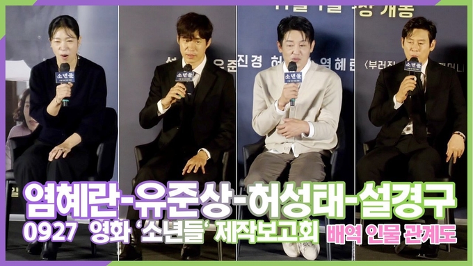 [뉴스인스타 양철수기자] 9월 27일(수) 오후, 서울시 용산구 CGV 용산아이파크몰에서 영화 '소년들' 제작보고회가 열려 배우 설경구, 유준상, 허성태, 염혜란, 정지영 감독이 참석해 공통 인터뷰를 진행하고 있다.