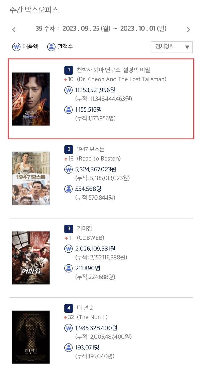 <천박사 퇴마 연구소: 설경의 비밀> 은 귀신을 믿지 않지만 귀신 같은 통찰력을 지닌 가짜 퇴마사 ‘천박사’(강동원)가 지금껏 경험해본 적 없는 강력한 사건을 의뢰받으며 시작되는 이야기를 그린 영화. 개봉 첫 날 14만 관객을 동원하며 박스오피스 1위에 등극한 뜨거운 화제작 <천박사 퇴마 연구소: 설경의 비밀>이 개봉 첫 주 누적 관객수 1,173,956명을 동원, 개봉 이후 5일 연속 박스오피스 정상을 석권했다. 이는 같은 날 개봉한 경쟁작 <1947 보스톤>, <거미집>을 모두 제친 것으로 <천박사 퇴마 연구소: 설경의 비밀> 의 뜨거운 화제성을 입증하며 앞으로의 적수 없는 흥행 독주를 예고하고 있다. 뿐만 아니라 동시기 개봉작 중 가장 높은 좌석 판매율을 기록하고 있어 관객들의 높은 관심과 함께 앞으로 계속될 흥행 레이스에 귀추가 주목된다.