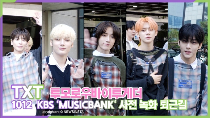 [뉴스인스타 양철수기자] 10월 12일(목) 오전, 서울시 영등포구 여의도 KBS 신관에서 진행된 KBS 2TV ‘뮤직뱅크’ 사전 녹화를 마치고 그룹 투모로우바이투게더(TXT) 수빈, 연준, 범규, 태현, 휴닝카이가 방송국을 나서며 팬들에게 인사를 하고 있다.