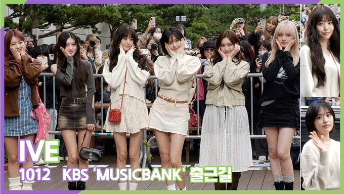 [뉴스인스타 양철수기자] 10월 13일(금) 오전, 서울시 영등포구 여의도 KBS 신관 공개홀에서 생방송으로 진행되는 KBS '뮤직뱅크' 리허설에 참석하기 위해 그룹 IVE(아이브) 가을, 원영, 리즈, 이서가 방송국에 도착해 포즈를 취하고 있다.