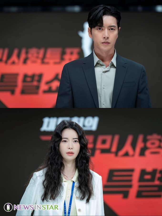 공개된 사진은 ‘채도희의 국민사형투표 특별쇼’ 생방송이 진행 중인 스튜디오에 김무찬, 주현 등 경찰이 등장한 모습을 담고 있다. 앞서 아들 이민수(김권 분)가 개탈과 관련 있음을 알게 된 민지영은 채도희에게 국민사형투표 특별쇼를 제안, 여론을 자신의 편으로 끌어들이려 했다. 채도희 역시 민지영의 제안을 덥석 물었다. 그렇게 두 사람의 욕망이 맞물린 것이 국민사형투표 특별쇼다.