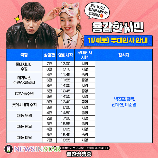 개봉 2주차 주말인 11월 4일(토) 박진표 감독, 배우 신혜선, 이준영이 참석하는 무대인사는 롯데시네마 수원을 시작으로 메가박스 수원 AK플라자, CGV 동수원, 롯데시네마 수지, CGV 오리, CGV 판교, CGV 야탑까지 다양한 지역에서 관객들을 만난다. 개봉 무대인사에서 역대급 팬서비스와 유쾌한 입담으로 화제를 모은 <용감한 시민>은 2주차 무대인사에서도 극장을 찾은 관객들과 유쾌하고 통쾌한 시간을 보낼 예정이다. <용감한 시민>의 무대인사에 대한 일정 마인드마크 공식 SNS에서 확인할 수 있으며 각 극장 홈페이지, 어플리케이션에서 예매 가능하다.