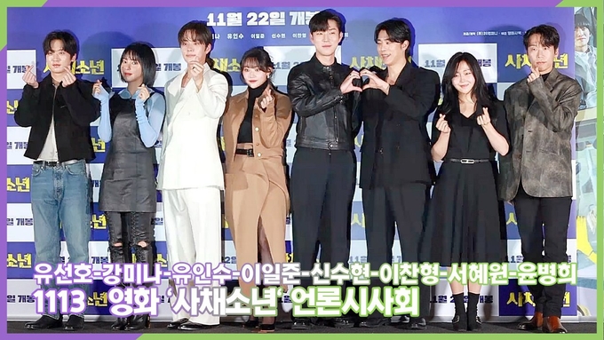 [뉴스인스타 양철수기자] 11월 13일(월) 오후, 서울시 용산구 CGV 용산아이파크몰에서 영화 '사채소년'의 언론시사회 & 기자간담회가 열려 배우 유선호-강미나-유인수-이일준-신수현-이찬형-서혜원-윤병희가 참석해 포토타임을 갖고 있다.