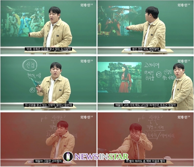 <외계+인> 2부는 치열한 신검 쟁탈전 속 숨겨진 비밀이 밝혀지는 가운데 미래로 돌아가 모두를 구하려는 인간과 도사들의 이야기를 그린 영화다. 지난 12월 1일(금) CJ ENM Movie 유튜브 채널을 통해 공개된 ‘문쌤의 알잘딱깔센 1부 요약’ 영상이 흥미를 자극하고 있다. 영상은 배우 겸 크리에이터 문상훈의 부캐 한국지리 강사 문쌤이 외계인의 존재를 믿지 않는 학생들에게 직접 <외계+인> 1부의 스토리를 요약해서 들려주며 이목을 집중시킨다. 특히 문쌤은 ‘하바’, ‘신검’ 등 영화 속 세계관을 관통하는 설정부터 현대와 과거를 오가는 다채로운 캐릭터들의 활약상까지 전하며 과몰입하는 모습으로 유쾌한 웃음을 자아낸다. 급기야 신검을 가지고 온 문쌤은 신검을 둘러싼 인물들 간의 대결 구도를 긴장감 넘치게 설명하며 족집게 강사의 면모를 유감없이 발휘, 2부에서 마침내 완결될 서사에 대한 궁금증을 한껏 끌어올린다.