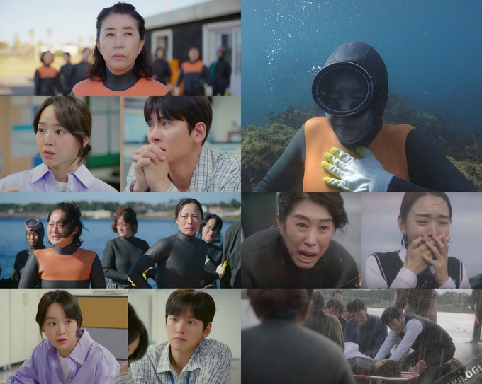생각이 많아지자 물질 중 해녀회장답지 않은 실수도 이어졌다. 전복을 따면서도 상념에 빠진 미자가 결국 손에 빗창에 긁힌 상처를 입은 것. 장갑 안에서 피가 흘러나오자 물 위로 올라오던 중, 갑자기 거대한 물살이 그녀를 덮치며 다시 물속으로 빨려 들어갔다. 곳곳에 암초들이 도사려 위험천만한 상황이었지만, 해녀 양부자(김미화)의 발 빠른 도움으로 가까스로 빠져나올 수 있었다. 기상청에서 CCTV로 미자의 꽃무늬 태왁을 찾던 용필도 놀란 가슴을 쓸어 내렸다.
