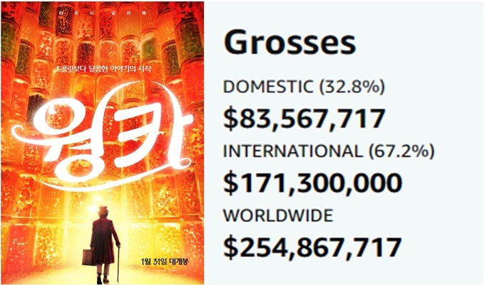 박스오피스 모조에 따르면 <웡카>는 <아쿠아맨과 로스트 킹덤>에 이어 북미 박스오피스 2위에 등극, 북미 8천 356만 달러(한화 약 1,088억 원)의 수익을 기록했다. 전 세계 흥행 수익은 무려 2억 5,486만 달러(한화 약 3,320억 원)로 단숨에 2023년 전 세계 흥행 TOP 20위에 오른 것은 물론, 제작비(1억 2,500만 달러)의 2배를 벌어들여 놀라움을 더한다.