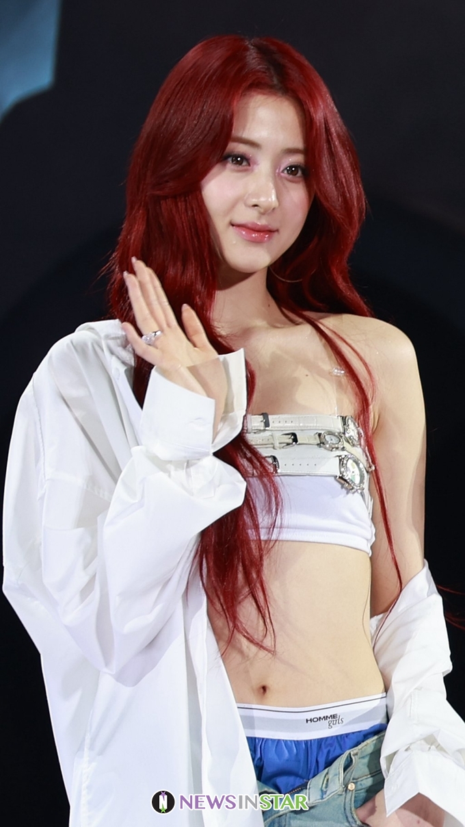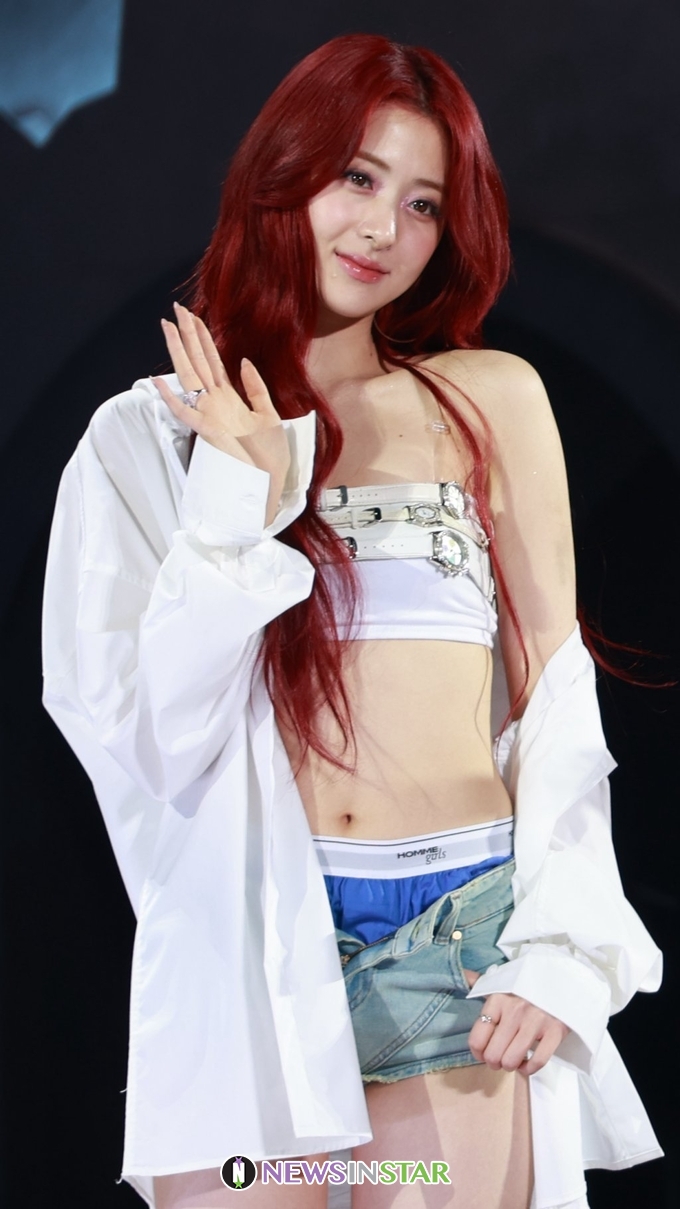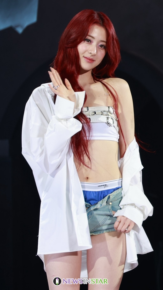 [뉴스인스타 양철수기자] 2월 19일(월) 오후, 서울시 성북구 고려대학교 화정체육관에서 그룹 르세라핌(LE SSERAFIM)의 세번째 미니앨범 'EASY(이지)' 발래 기념 쇼케이스가 열려 허윤진이 포토타임에 포즈를 취하고 있다.