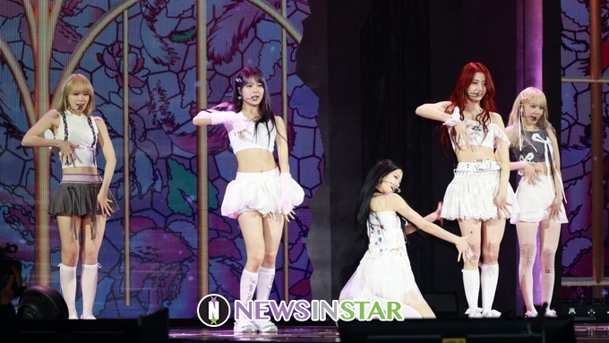 [뉴스인스타 양철수기자]  2월 19일(월) 오후, 서울시 성북구 고려대학교 화정체육관에서 그룹 르세라핌(LE SSERAFIM)의 세번째 미니앨범 'EASY(이지)' 발래 기념 쇼케이스가 열려 김채원, 사쿠라, 허윤진, 카즈하, 홍은채가 수록곡 'SWAN SONG' 무대를 선보이고 있다.