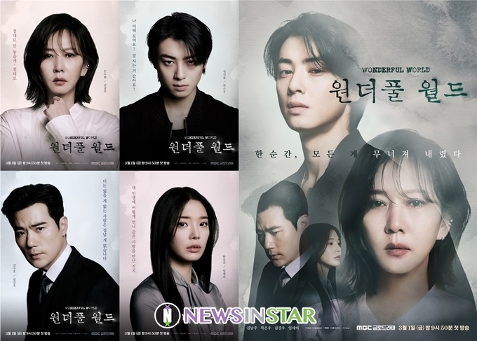 무엇보다 단체 포스터는 김남주, 차은우, 김강우, 임세미의 서로 다른 시선에 조명하며 극의 미스터리한 무드를 한껏 끌어올린다. 각기 다른 방향을 응시하고 있는 4인이 겹겹이 쌓여 있는 모습 위로 눈물에 얼룩진 듯한 제목과 '한 순간, 모든 게 무너져 내렸다'는 카피가 더해져, 이들을 비극으로 몰고 간 '그날'의 사건에 궁금증을 높이는 것. 이에 2024년 가장 처절하고 강렬한 미스터리의 포문을 열 '원더풀 월드'에 기대감이 수직 상승한다.
