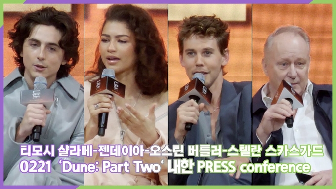 [뉴스인스타 양철수기자] 2월 21일(수) 오후, 서울시 영등포구 여의도 콘래드 서울에서 영화 '듄 : 파트2' 내한 기자간담회가 열려 배우 티모시 샬라메-젠데이아-오스틴 버틀러-스텔란 스카스가드가 간담회 시작 인사를 하고 있다.