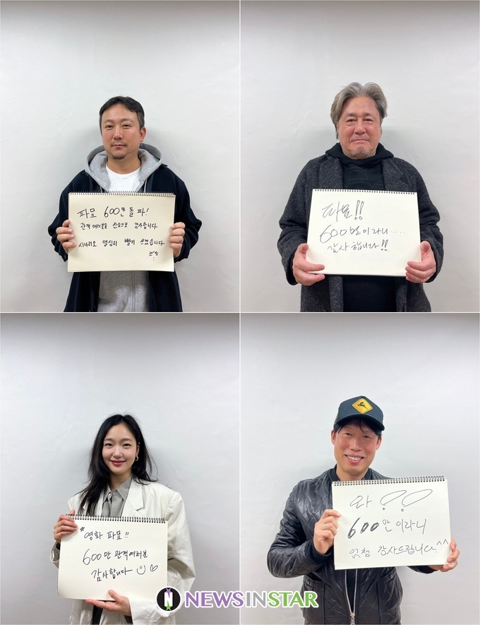 관객들의 사랑에 보답하고자 <파묘> 팀은 자필로 적은 감사 메시지를 공개했다. 544만 관객을 돌파한 전작 <검은 사제들>의 스코어를 뛰어넘으며, 자체 최고 흥행 기록을 경신한 장재현 감독은 “<파묘> 600만 돌파! 관객 여러분들 진심으로 감사합니다. 시나리오 열심히 빨리 쓰겠습니다”라며 재치 있게 감사를 전했다. 이어 프로페셔널한 연기 호흡으로 몰입도를 높이며 극의 재미를 끌어올린 최민식, 김고은, 유해진, 김재철 배우가 관객들에게 친필 메시지로 감사 인사를 전했다. 최민식은 “<파묘>!! 600만이라니… 감사합니다!!”, 김고은은 “영화 <파묘>!! 600만 관객 여러분 감사합니다 ♡”, 유해진은 “와!! 600만이라니 엄청 감사드립니다^^”, 김재철은 “600만!! <파묘> 사랑해 주신 관객분들 감사합니다 ♥”라며 600만 돌파에 대한 기쁨과 진심 어린 감사를 표현했다.