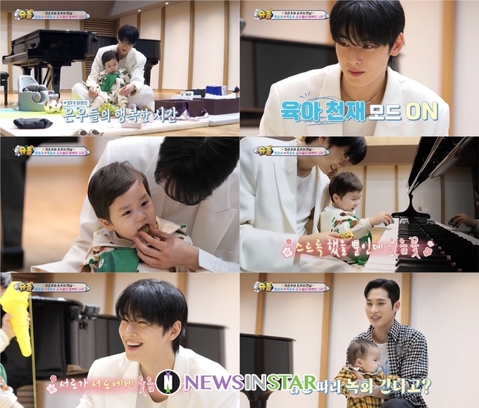 그런가 하면 차은우는 육아까지 설레는 모습으로 시선을 사로잡았다. 차은우는 은우를 위해 딸기와 샤인머스캣을 선물했다. 차은우는 은우가 먹기 편하게 손을 닦아주고, 샤인머스캣을 반으로 잘라주며 눈에서 꿀이 뚝뚝 떨어지는 다정한 모습을 보였다. 급기야 은우도 차은우의 달콤함에 사르르 녹아 어느새 차은우의 무릎 위에 안착해 떨어질지를 몰랐다. 더욱이 차은우는 음악을 좋아하는 은우에게 피아노 연주를 선사하며 백 점 육아를 선보였다. 은우도 차은우의 섬세한 육아에 “좋아”라며 웃음꽃을 피웠고, 차은우와 헤어질 시간이 다가오자 “은우 못 가”라며 아쉬움을 드러냈다. 이에 차은우가 선사한 달콤한 육아는 여심뿐만 아니라 은우의 마음까지 사로잡으며 은혜로운 하루를 완성했다.
