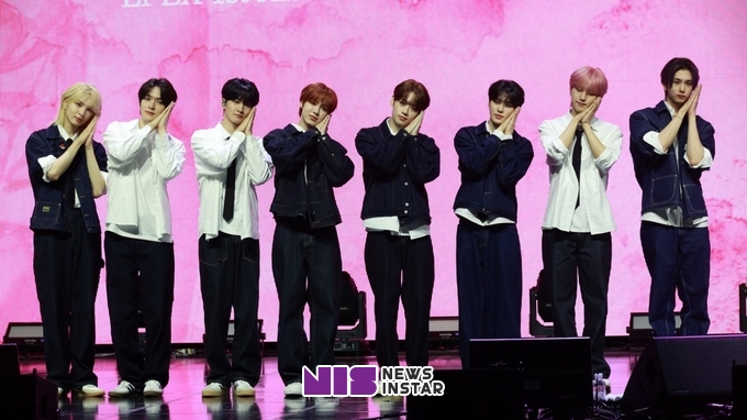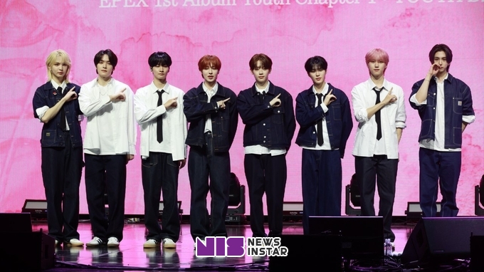 [뉴스인스타 양철수기자] 4월 9일(화) 오후, 서울시 용산구 한남동 블루스퀘어에서 그룹 이펙스(EPEX)의 첫 번째 정규앨범 '소화(韶華) 1장 : 청춘 시절' 발매 기념 미디어 쇼케이스가 열려 위시, 금동현, 뮤, 아민, 백승, 에이든, 예왕, 제프가 참석해 포토타임에 포즈를 취하고 있다.