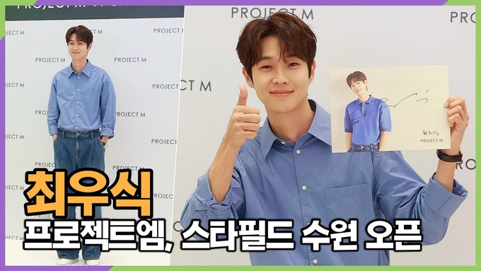 이날 최우식은 '프로젝트엠'의 내추럴한 매력의 포플린 셔츠와 와이드한 핏의 데님 팬츠를 착용해 깔끔한 워크웨어 무드를 선보였다.