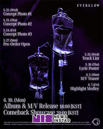 스케줄러에 따르면, 에버글로우는 22일부터 3일간 세 버전의 콘셉트 포토를 공개하며 27일 예약 판매를 시작할 예정이다.