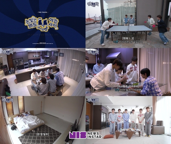 ‘눈빛만 봐도 아는 사이’는 텔레파시 게임과 여행을 결합한 예능 포맷이다. 첫 자체 예능 ‘엎어지면 코 닿을 사이’에서 단체 여행 선물을 받았던 투어스는 이번에 함께 펜션으로 떠나 다양한 미션을 수행했다.