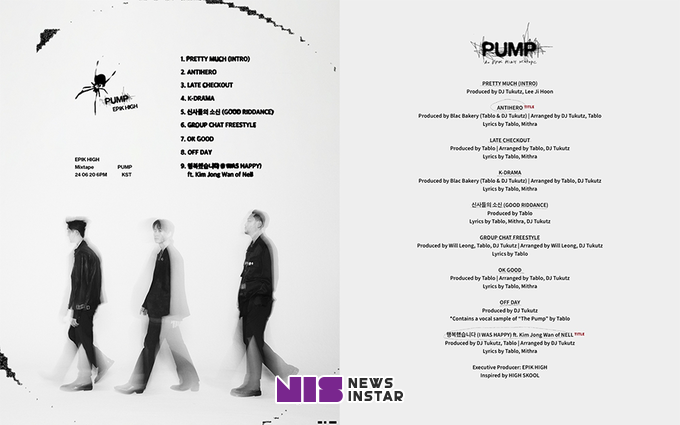 에픽하이(타블로, 투컷, 미쓰라)는 지난 10일 공식 SNS를 통해 신보 'PUMP(펌프)'의 트랙리스트 이미지를 공개했다.