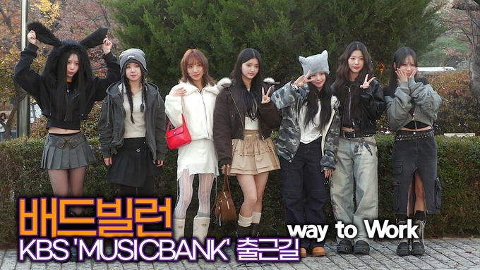 [뉴스인스타 양철수기자] 11월 22일(금) 오전, 서울시 영등포구 여의도 KBS 별관 공개홀에서 생방송으로 진행되는 KBS 'MUSICBANK' 리허설을 위해 그룹 배드빌런(BADVILLAIN) 엠마, 클로이 영, 휴이, 윤서, 이나, 빈, 켈리가 방송국에 도착해 포토타임을 갖고 있다.