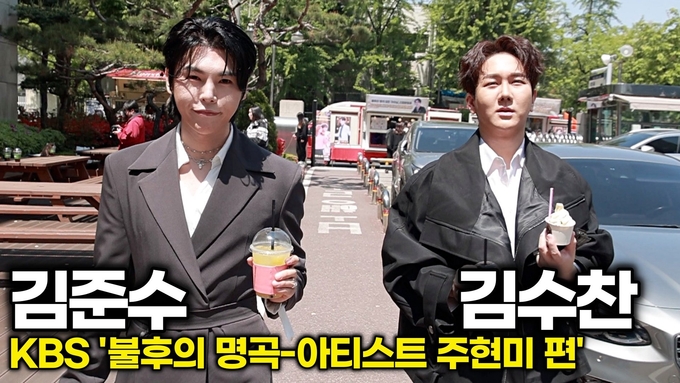 [뉴스인스타 양철수기자] 4월 28일(월) 오전, 서울시 영등포구 여의도 KBS 신관 TV공개홀에서 진행되는 KBS '불후의 명곡 - 아티스트 주현미 편' 녹화를 위해 가수 김수찬, 김준수가 방송국에 도착해 팬들이 선물한 커피차 인증을 하고 있다.