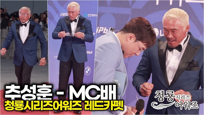 [뉴스인스타 양철수기자] 7월 18일(금) 오후, 인천광역시 중구 운서동 파라다이스시티에서 청룡시리즈어워즈 식전행사인 레드카펫이 열려 MC배가 추성훈의 안경을 닦아주고 있다.
