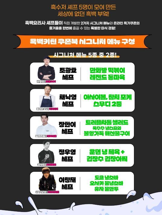 흑백키친은 조광효, 채낙영, 장한이, 정우영, 이창재 셰프 등 실력파 셰프 5인으로 구성됐으며, 이들이 선보이는 특별한 메뉴를 보다 합리적인 가격에 즐길 수 있도록 마련된 것이 이번 쿠폰북이다.