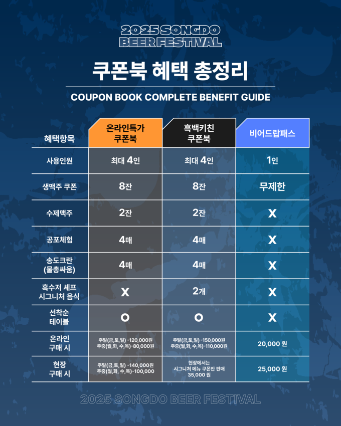 또한 온라인에서 판매되는 쿠폰북 필수 구매가 아닌 선택 옵션이다. 풍성한 프로그램과 음식·음료를 편리하게 즐기고 싶은 관람객을 위해 다양한 티켓이 마련되어 있으며, 현재 티켓링크와 네이버에서 예매 가능하다. 쿠폰 수령 부스는 주중(월~목) 오후 4시, 주말(금~일) 오후 12시 30분부터 관람객을 맞이하며, 이곳에서는 축제 분위기를 더해줄 MD상품도 함께 판매될 예정이다.