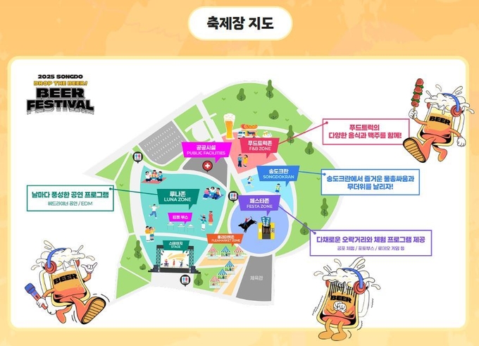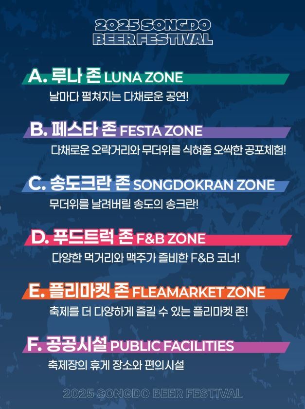 송도맥주축제운영위원회가 주최·주관하는 2025 송도맥주축제가 관람객들을 위한 다양한 구역별 프로그램을 공개했다. 축제장 구역은 루나존, 페스타존, 송도크란존, 푸드트럭존, 플리마켓존, 공공시설존 등으로 나뉘어 운영된다.