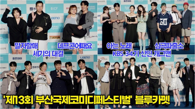 [뉴스인스타 양철수기자] 8월 29일(금) 오후, 부산시 해운대구 우동 벡스코 오디토리움에서 열린 ‘제13회 부산국제코미디페스티벌’ 블루카펫에 KBS 개그콘서트 '말자할매' '데프콘어때요' '아는노래' '심곡파출소' '세기의대결' 공연팀이 포토타임을 갖고 있다.