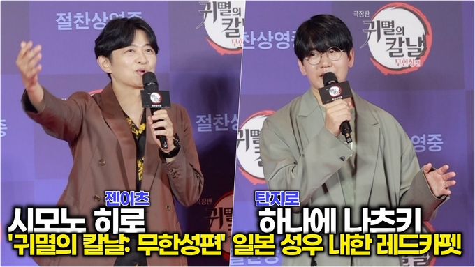 [뉴스인스타 양철수기자] 8월 30일(토) 오후, 서울시 용산구 CGV 용산아이파크몰에서 극장판 '귀멸의 칼날: 무한성편' 일본 성우 내한 레드카펫 행사가 열려 성우 하나에 나츠키(탄지로 역)와 시모노 히로(젠이츠 역)가 참석해 인터뷰를 진행하고 있다.