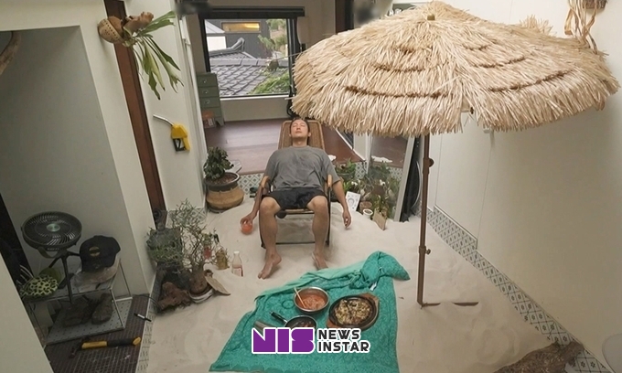 “치울 걱정하면 아무것도 못 해요!”라며 로망 실현에 대한 확고한 소신을 밝힌 김대호. 중정을 가득 채운 모래를 만지며 광기 어린 눈빛을 발산하는 김대호의 표정에서 그의 진심이 느껴진다. 또한 그는 모래 위에 커다란 라탄 파라솔까지 설치해 해변 분위기를 끌어올린다.
