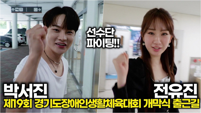 [뉴스인스타 양철수기자] 9월 12일(금) 오후, 경기도 파주시 파주스타디움에서 제19회 경기도장애인생활체육대회 2025 파주 개막식 축하 공연을 위해 가수 박서진, 전유진이 출근하며 선수단에게 파이팅 응원을 하고 있다.