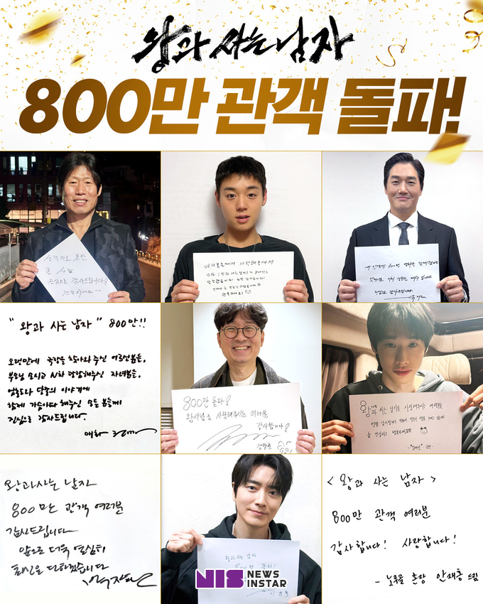또한 800만 관객 돌파를 맞아 '왕과 사는 남자'의 장항준 감독은 "왕과 사는 남자를 사랑해 주신 관객분들께 너무나 감사하다. 800만 관객이 영화를 봐주셨는데, 나뿐만 아니라 제작진들과 배우들도 다들 상상해 본 적이 없는 숫자라는 생각을 한다. 모두가 하루하루 감사한 마음으로 지내고 있다"며 흥행에 대한 벅찬 소감을 전했다. 배우들 역시 친필 감사 메시지를 공개했다. 광천골 촌장 엄흥도 역의 유해진은 “생각지도 못한 큰 사랑. 진심으로 감사드립니다! 건강하세요^^”, 어린 선왕 이홍위 역의 박지훈은 “여러분들께서 사랑해주셔서 영화 <왕과 사는 남자>가 800만을 달성했습니다! 정말 감사합니다! 언제나 늘 열심히 하겠습니다♡ 행복하세요!” , 권력자 한명회 역의 유지태는 “내 인생에 800만 영화를 함께했다는 것만으로 이미 성공한 배우입니다. 진심으로 감사드립니다”, 궁녀 매화 역의 전미도는 “<왕과 사는 남자> 800만!! 오랜만에 극장을 찾아와주신 어르신분들, 부모님 모시고 N차 관람해주신 자녀분들, 엄흥도와 단종의 이야기에 함께 가슴 아파해주신 모든 분들께 진심으로 감사드립니다”, 흥도의 아들 태산 역의 김민은 “<왕과 사는 남자>를 사랑해주시는 여러분들 정말 감사합니다. 덕분에 행복한 시절을 보내고 있습니다. 늘 건강하고 행복하세요♡”라며 800만 관객을 달성한 기쁜 마음을 전했다. 또한, 영월군수 역의 박지환은 “<왕과 사는 남자> 800만 관객 여러분 감사드립니다. 앞으로 더욱 열심히 최선을 다하겠습니다”, 금성대군 역의 이준혁은 “<왕과 사는 남자> 800만 돌파! 진심으로 감사합니다”, 노루골 촌장 역의 안재홍은 “<왕과 사는 남자> 800만 관객 여러분 감사합니다! 사랑합니다!”라며 감사의 인사를 전했다. 몰입감을 극대화하는 배우들의 눈부신 열연과 모두가 알고 있는 역사 속 아무도 몰랐던 단종의 숨겨진 이야기로 가슴 깊은 여운을 전하는 영화 <왕과 사는 남자>는 앞으로도 거침없는 흥행 질주를 이어갈 전망이다.