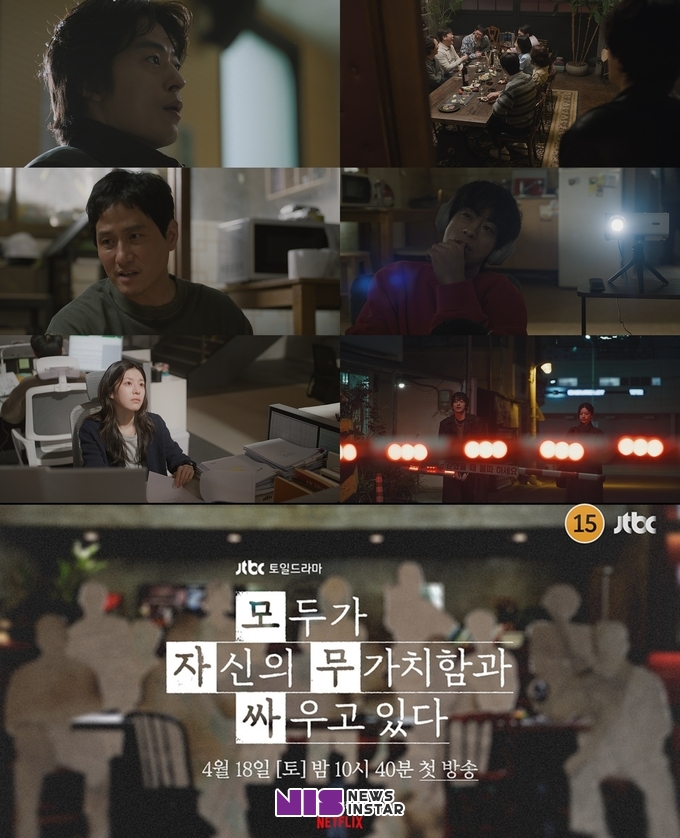 상반기 최고 기대작 JTBC 새 토일드라마 ‘모두가 자신의 무가치함과 싸우고 있다’(연출 차영훈, 극본 박해영, 제작 스튜디오 피닉스·SLL·스튜디오 플로우, 이하 ‘모자무싸’)의 첫 회를 소개하는 예고 영상은 먼저 영화감독이라는 꿈을 향해 외로운 질주를 이어가는 황동만(구교환)을 비춘다. 20년이라는 긴 세월 동안 포기하지 않고 고군분투했지만, 여전히 데뷔의 문은 굳게 닫혀 있다. 이에 그의 주변은 “황동만이 데뷔할 수 있을 것 같아?”, “누군가는 그만하라고 얘기해줘야 되는 거 아니냐”라는 냉소적인 시선으로 가득하다. 형 황진만(박해준)마저, 제대로 된 일은 “아침에 눈뜨면 씻고 나가서, 어금니 꽉 깨물고 죽기 살기로 하는 것”이라며 다그친다.
