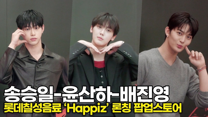 [뉴스인스타 양철수기자] 4월 13일(월) 오후, 서울시 영등포구 신도림동 타임스퀘어에서 롯데칠성음료 프리바이오틱소다 ‘해피즈(Happiz)’ 론칭 기념 포토행사가 열려 송승일, 윤산하, 배진영이 참석해 포토타임을 갖고 있다.