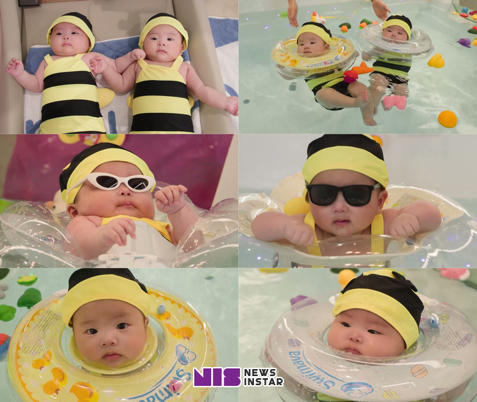 특히 강단둥이남매의 앙증맞고 사랑스러운 꿀벌 수영복 비주얼이 공개돼 시선을 사로잡는다. 강이와 단이는 똑같은 꿀벌 수영복에 꿀벌 수영모자까지 풀장착하고 ‘쌍둥이 꿀벌’ 케미를 뽐내고 있다. 등 뒤에 빼꼼 하고 보이는 날개가 강단둥이남매의 귀여움을 배가시키는가 하면, 목튜브를 착용하고 물에 떠 있는 강단둥이남매의 모습이 복사 붙여넣기를 한 것 마냥 똑 닮아 절로 미소를 짓게 만든다. 김종민은 “크면서 더 닮아간다”며 감탄하고 랄랄은 “진짜 닮았다. 쌍둥이 맞네”라며 눈을 떼지 못한다.
