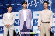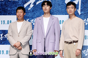 배우 유해진, 류준열, 조우진이 3일 오전 서울 강남구 CGV 압구정에서 열린 영화 '봉오동 전투' 제작보고회에서 포즈를 취하고 있다. '봉오동 전투'는 1920년 6월, 죽음의 골짜기로 일본 정규군을 유인해 최초의 승리를 이룬 독립군의 전투를 그린 영화다. 8월 개봉 예정이다.