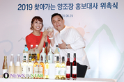 요리연구가 홍신애, 개그맨 정준하가 25일 오후 서울 중구 퍼시픽 호텔에서 열린 '2019 찾아가는 양조장' 홍보대사 위촉식에서 포즈를 취하고 있다.