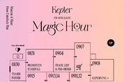 그룹 케플러(Kep1er)가 새 앨범 프로모션 스케줄러를 공개하며 본격적인 컴백 카운트다운에 돌입했다. 케플러(최유진, 샤오팅, 마시로, 김채현, 김다연, 히카루, 휴닝바히에, 서영은, 강예서)는 31일 0시 공식 SNS를 통해 내달 25일 발매될 미니 5집 'Magic Hour (매직 아워)'의 프로모션 스케줄러를 게재했다. 공개된 스케줄러는 층별 안내도를 연상케 하는 독특하고 러블리한 무드로 시선을 사로잡았다. 이에 따르면, 케플러는 다음 달 4일 트랙리스트를 시작으로 11일부터 19일까지 'SUNKISSED', 'MOONLIGHTED', 'BELOVED' 등 세 가지 버전의 콘셉트 포토를 선보인다. 특히 16일과 17일에는 콘셉트 포토와 이모티콘만이 적혀 있어 무엇을 의미할지 궁금증을 높인다. 이어 20일 하이라이트 메들리, 21일과 22일에는 타이틀곡의 뮤직비디오 티저 영상 두 편이 순차적으로 게재되는 가운데, 매주 수요일에는 자체 콘텐츠 'Kep1erving (케플러빙)'을 통해 숨겨둔 반전 매력은 물론 케미스트리와 예능감을 방출하며 컴백을 기다리는 팬들과 한층 가깝게 소통할 계획이다. 'Magic Hour'는 케플러가 지난 4월 발표한 미니 4집