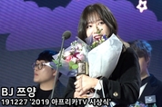 27일 오후 서울 서초구 양재동에 위치한 양재aT센터에서 '2019 아프리카TV 시상식(= 2019 BJ Awards)'이 진행되어 BJ 쯔양이 '먹방 BJ 여자' 부문에서 대상을 수상 받고 있다.