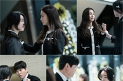 '마당이 있는 집' 김태희-임지연-김성오가 최재림의 장례식장에서 조우한다. 잔뜩 날이 선 세 사람의 모습이 긴장감을 치솟게 한다. 방송 첫 주부터 국내외 시청자들의 뜨거운 호평을 얻으며 2023년 최고의 웰메이드 스릴러로 우뚝 선 지니 TV 오리지널 드라마 ‘마당이 있는 집’(연출 정지현, 허석원/극본 지아니/기획 KT스튜디오지니/제작 스튜디오드래곤, 영화사 도로시, 이하 '마당집') 측이 오늘(26일) 3회 방송을 앞두고, 장례식장 한복판에서 벌어진 문주란(김태희 분)-추상은(임지연 분)-박재호(김성오 분)의 신경전을 현장 스틸로 공개해 이목을 집중시킨다. 지난 '마당집' 2회에서는 갑작스러운 죽음을 맞이한 김윤범(최재림 분)이 상은에게 상습 가정폭력을 저질러왔을 뿐만 아니라 재호의 미성년자 성매매 정황을 빌미로 금전 협박을 해왔다는 사실이 밝혀졌다. 이와 함께 윤범의 사망 당일, 상은과 재호 각각이 보인 수상쩍은 행보들이 드러나 시청자들을 출구 없는 미스터리 속으로 초대했다. 뿐만 아니라 극 말미에는 상은이 남편을 따라 재호에게 협박 문자를 보내고, 이를 재호 대신 주란이 받으면서 거대한 파란이 들이닥친 상황이다. 이 가운데 공개된 스틸 속에는 윤범의 장