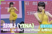 [케이팝인스타 양철수기자] 8월 3일(수) 오후, 서울시 광진구 광장동 예스24 라이브홀에서 두번째 미니 앨범 'SMARTPHONE' 쇼케이스가 열려 가수 최예나(YENA)가 타이틀곡 '스마트폰' 무대를 선보이고 있다. YENA 특유의 상큼하고 긍정적인 에너지가 고스란히 담긴 두번째 미니앨범 'SMARTPHONE'을 통해 힙하고 레트로한 바이브와 청량하고 상큼한 매력이 기대된다. ’케이팝인스타' YouTube 구독! 購讀! subscription! ☞ https://url.kr/7e6pg4