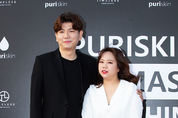 디자이너 제이쓴, 개그맨 홍현희가 12일 오후 서울 영등포구 서울마리나에서 열린 '퓨리스킨 LED 마스크' 론칭 기념 행사에 참석해 포즈를 취하고 있다.