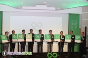 22일 오후 서울시 중구 을지로 SK텔레콤 본사 '행복 커뮤니티 런칭 세레모니'행사가 열려 (왼쪽부터) 김수영 양천구청장, 임진찬 대전 서구 부구청장, 서철모 화성시장, 문석진 서대문구청장, 박정호 SK텔레콤 사장, 정원오 성동구청장, 정순균 강남구청장, 채현일 영등포구청장, 민형배 청와대 비서실 사회정책비서관이 인증 서명식을 진행하고 있다.